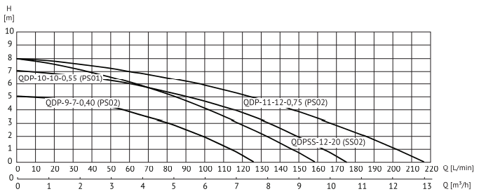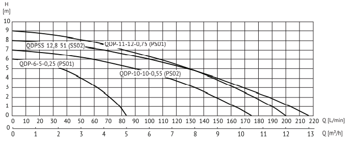 Корпус насоса выполнен из пластика (для насосов QDP) или из нержавеющей стали (для насосов QDPSS). Гидравлическая часть насоса состоит из рабочего колеса и корпуса насоса с направляющими лопатками. Открытая конструкция рабочего колеса обеспечивает свободный проход твердых частиц диаметром до 20 мм. Двигатель у погружных насосов серии QDP охлаждается перекачиваемой жидкостью.